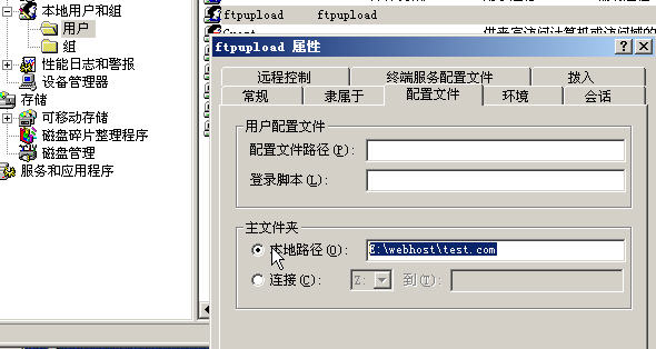 建立帳號,并修改主文件夾路徑為你指定的目錄(指定的目錄必需要有此用戶的"完全控制"訪問權限,權限可以在目錄上右擊--->屬性里修改). | |